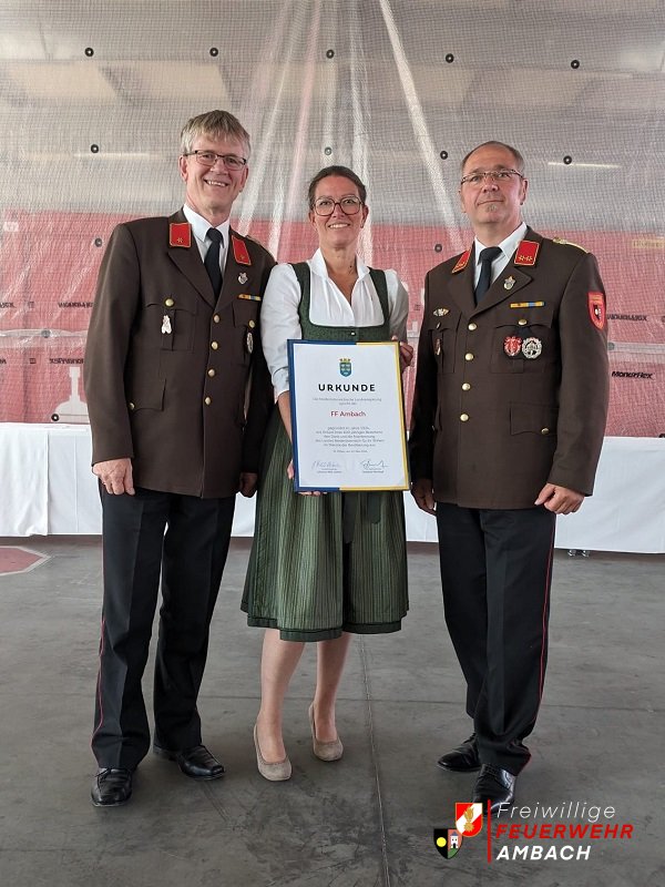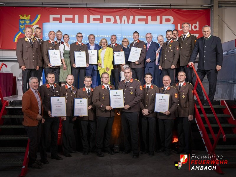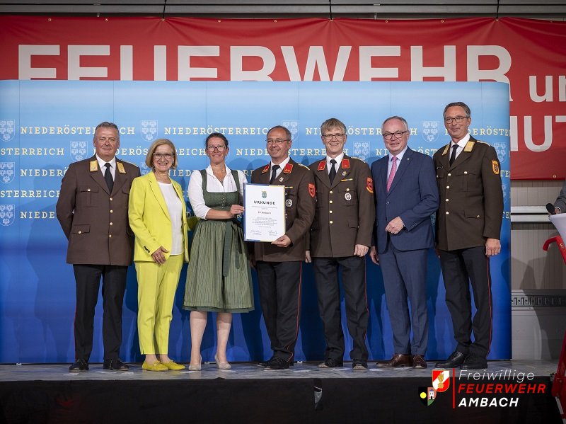 Am vergangenen Mittwoch den 22.05.2024 wurde der Freiwilligen Feuerwehr Ambach eine Urkunde der besonderen Art überreicht. Im Containerterminal des NÖ Landesfeuerwehrverbandes fand die Überreichung der Jubiläumsurkunden an die Feuerwehren, welche ihr 100, 125, 140, 150 oder 160-jähriges Bestandsjubiläum dieses Jahr feiern, statt. Da die FF Ambach dieses Jahr ihr 100-jähriges Bestehen feiert, wurde Kommandant Stefan Ackerling, Ehren-Kommandant Stellvertreter Josef Ganzberger und Bürgermeisterin Karin Gorenzel die Urkunde des Landes NÖ übergeben. Die Gratulanten waren niemand geringerer als Landesfeuerwehrkommandant Dietmar Fahrafellner, Landesfeuerwehrkommandant-Stellvertreter Martin Boyer, und Seitens der Politik Landeshauptfrau Johanna Mikl-Leitner sowie Landeshauptfrau-Stellvertreter Stephan Pernkopf. Auch auf diesem Wege bedankt sich die Freiwillige Feuerwehr Ambach für die Überreichung sowie die Einladung zu der gelungenen Veranstaltung. Fotos Fotos Matthias Fischer/NÖ LFKDO