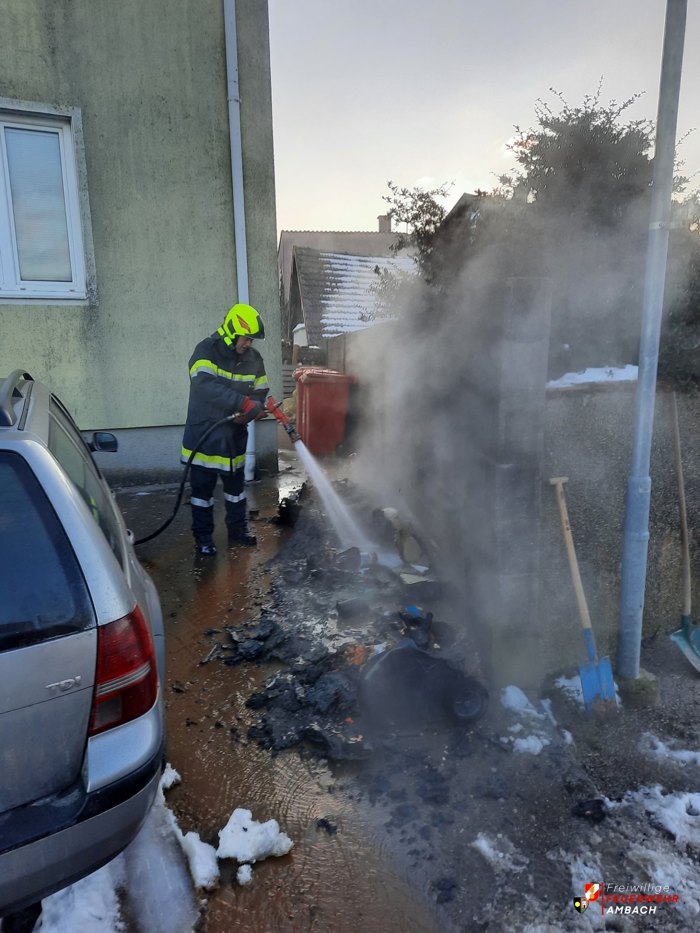 Zu einem "Brand im Freien" wurde die Freiwillige Feuerwehr Ambach in der Früh des 28.12.2025 nach Hausheim alarmiert. Aus unbekannter Ursache waren mehrere Mülltonnen in Brand geraten. Aufgrund der Nähe zu einem parkenden Auto sowie zu einem Wohnhaus, wurde vom Disponent die Alarmstufe B2 alarmiert was zur Folge hatte, dass alle 4 Gemeindefeuerwehren zu diesem Einsatz ausrückten. Durch das rasche Eingreifen der örtlich zuständigen Feuerwehr konnten weiterer Schäden verhindert werden. Beim Ankunft an der Einsatzstelle wurde die FF Ambach storniert und die Einsatzbereitschaft konnte wieder hergestellt werden.