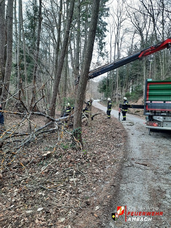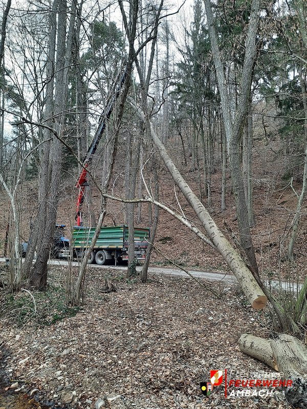 In der Mittagszeit des 29.Jänner 2022 rückte die Freiwillige Feuerwehr Ambach zu einem Sturmschaden in Ambach aus. Da der Baum zwischen zwei weiteren Bäumen eingeklemmt war und zusätzlich drohte auf eine Telefonleitung sowie in weiterer Folge auf die Straße zu stürzen, wurde dieser mittels Kran des "Lohnunternehmen Hirschmüller" gesichert und Stück für Stück abgetragen. In weiterer Folge wurden die Baumteile am Straßenrand abgelegt und die Fahrbahn gereinigt. Vielen Dank an David Hirschmüller für die gute Zusammenarbeit. Fotos